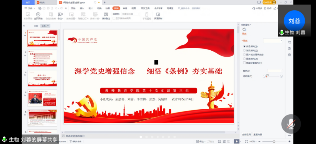 为了加深学生党员对党史的了解,增强青年党员“干实事”“解难事”“谋大事”“创新事”“长本事”的思想自觉性和行动自觉性,了解《中国共产党普通高等学校基层组织工作条例》,教师教育学院研究生第十支部全体党员于5月14日晚7点半在腾讯会议APP上开展了主题为“深学党史增强信念,细悟《条例》夯实基础”的主题党日活动。