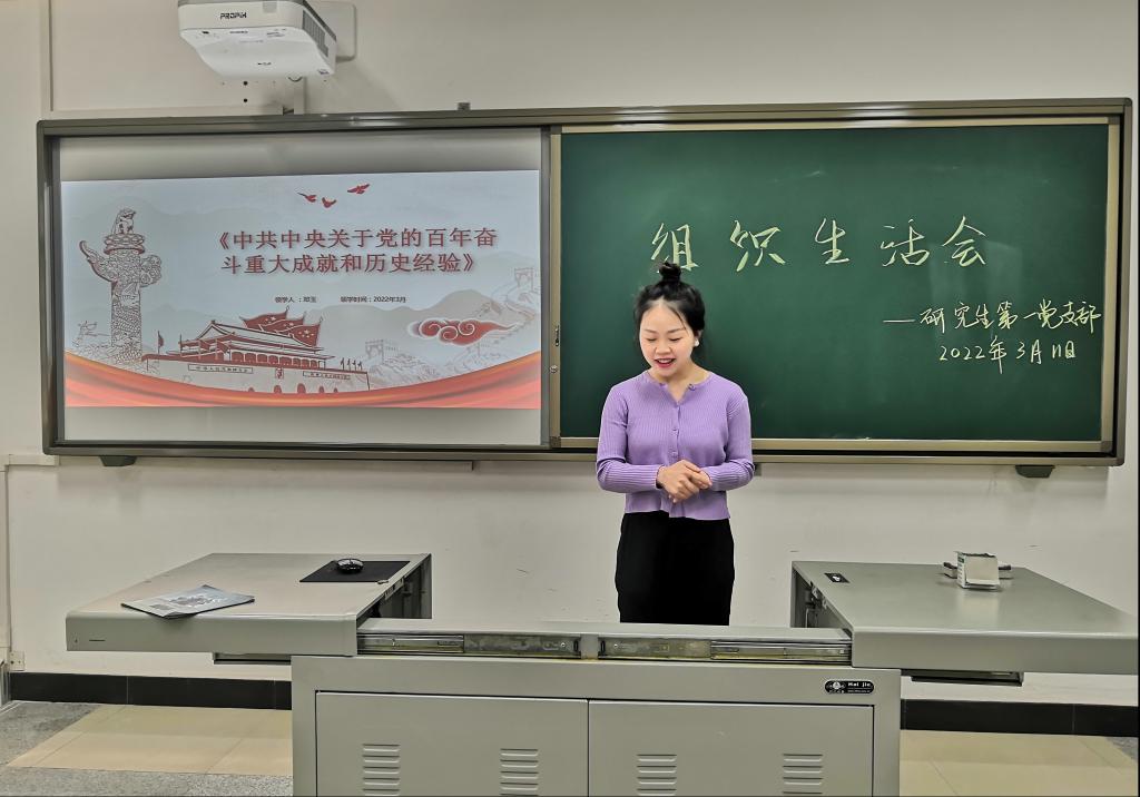 邓玉同志分享了以《中共中央关于党的百年奋斗重大成就和历史经验的决议》为主题的微党课,深入讲解了中国共产党立志于中华民族千秋伟业,一百年来,党始终践行初心使命,团结带领全国各族人民绘就了人类发展史上的壮美画卷。最后,她表示:“现在,在党团结带领中国人民又踏上了实现第二个百年奋斗目标新的赶考之路上,作为一名研究生党员同志。我们也一定要继续不懈上进,创新实践,做出好成绩,在新时代新征程上展现新青年的新气象、新作为。”