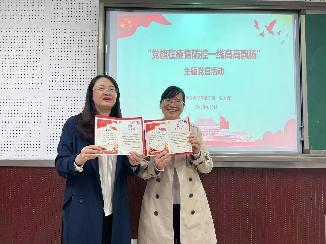 最后,支部为胡白云、邓晓芳同志过政治生日,范敏委员转交给两位党员学校党委制作的政治生日卡,两位党员合唱《党啊,亲爱的妈妈》,其他党员拍手应和,营造了浓厚的政治生日氛围。