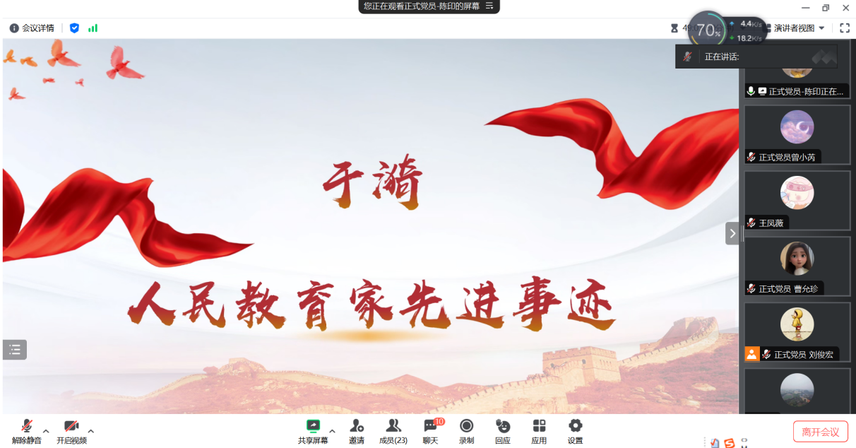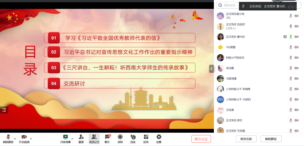 2023年10月18日,研究生第七党支部在腾讯会议开展了以“学习教育家精神,争做堪当重任的时代新人”为主题的十月主题党日活动。活动由组织委员刘俊宏主持。