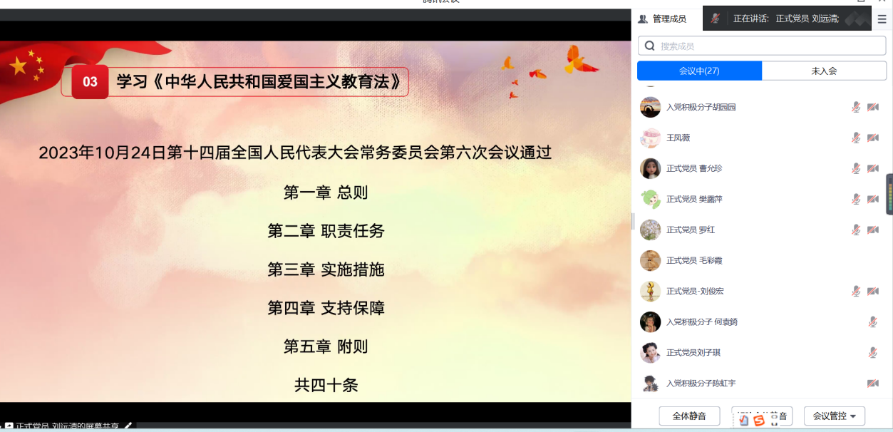 其次,刘远清从“为什么要进行爱国主义教育”“爱国主义教育的主要内容”“如何进行爱国主义教育”三个方面出发,带领支部成带领支部成员集中学习了《中华人民共和国爱国主义教育法》。
