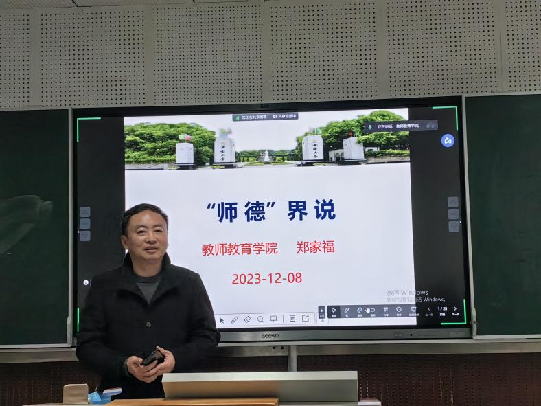 胡白云同志导学《习近平总书记在第十个国家宪法日之际作出的重要指示精神》。郑家福同志讲授微党课《“师德”界说》。首先,郑家福同志对“德”“道”进行文字学、语义学的考察,探究“道德”的历史、文化意蕴,结合政策文本,阐释了“师德”概念在行为主体外在行为和内在观念上的典型表现,强调了“师道”思想体系研究的紧迫性;其次,他认为,“师德”的本质是铸魂育人,建构教师的精神品质;最后,“师德”之养成是师德认知、师德情感、师德信念、师德意志、师德行为相互作用、有机统一的结果。立德必先立道,修德而后可以讲学。