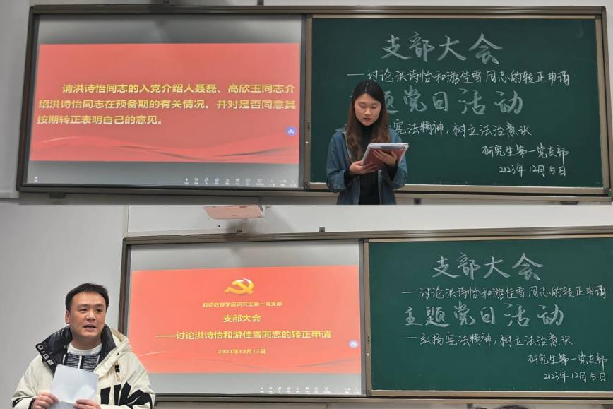 2023年12月15日下午,研究生第一党支部召开预备党员转正大会,讨论洪诗怡、游佳雪同志的转正申请,并以“弘扬宪法精神,树立法治意识”为主题开展了12月主题党日活动。党委陈铮副书记、支部邓磊书记出席本次会议,活动由支部组织委员杨琳同志主持。