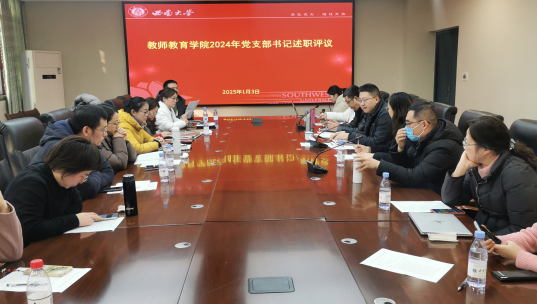 2025年1月3日上午,教师教育学院2024年党支部书记述职评议会议在师元楼208会议室顺利召开。学院党委委员、纪委委员、党支部书记参加会议,学校党委组织部组织科科长王新皓到会指导,党委副书记陈铮主持会议。