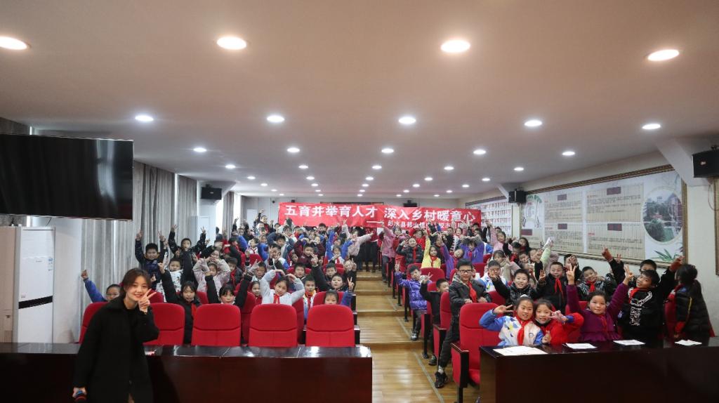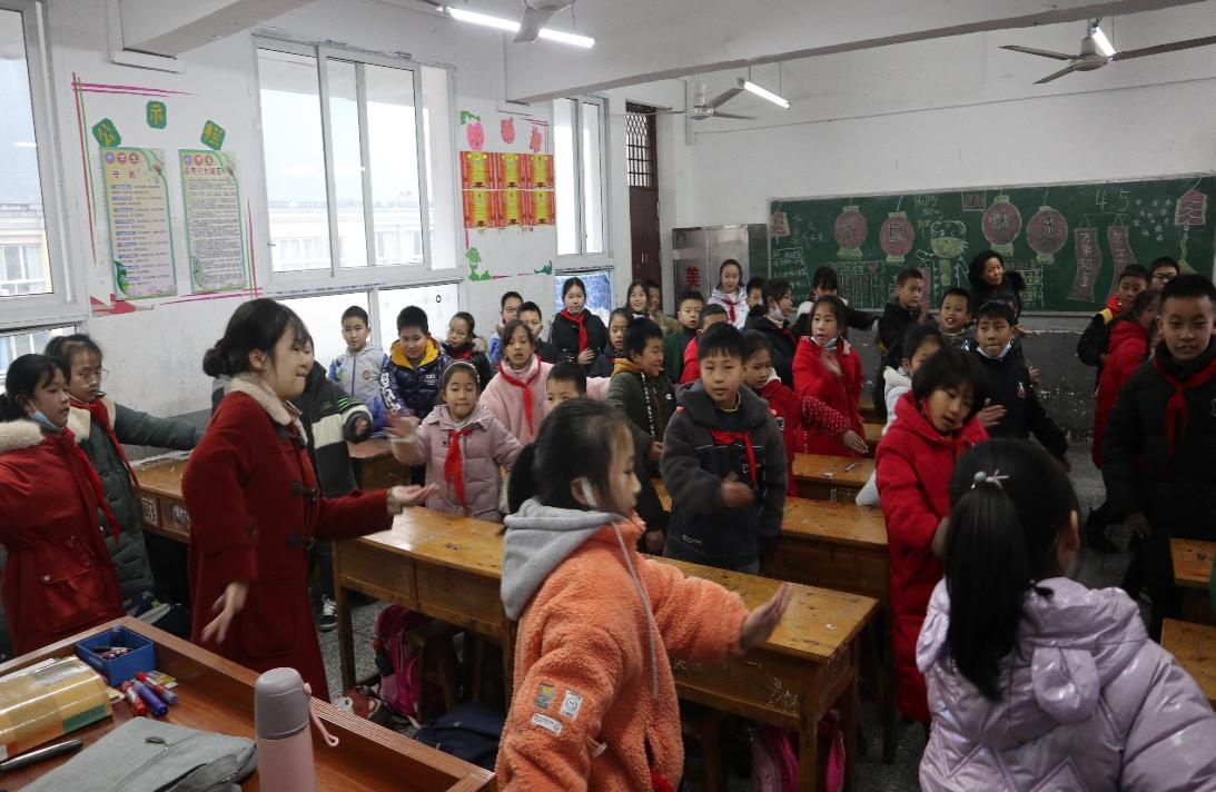 开展总结大会的目的在于提供一个舞台,让学生将前日的学习成果进行输出展示,形成一个学习的闭环。大会一开始进行了爱国主题知识有奖竞赛,活跃大会氛围。其余环节包括“涿鹿之战”演出、摆手舞展示、志愿者刘真情献唱《感恩的心》、新年祝福画作分享仪式、优秀个人与小组颁奖仪式。为了纪念与郁山中心校的相遇,我们还将这几天的瞬间剪辑成视频,在大会上播放,同学们会后纷纷围着志愿队成员留影纪念、送上自己的手工礼物。