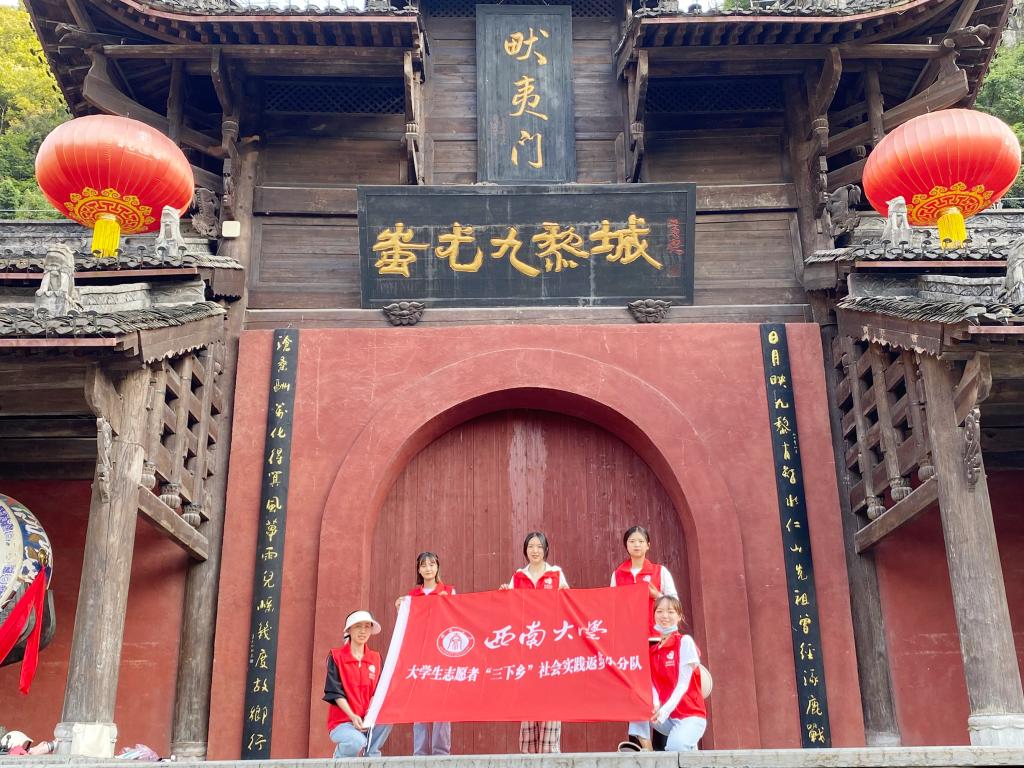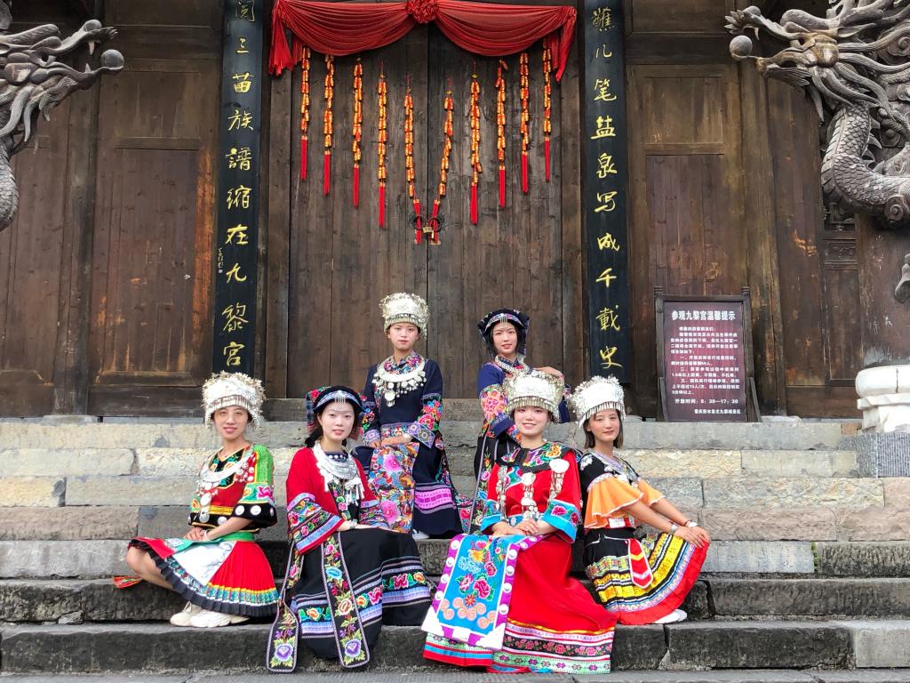 下午,小分队在李玲娟主任的推荐下,来到位于彭水县城的苗族特色景区蚩尤九黎城,开展“走进蚩尤部落,解密蚩尤文化”调研活动。在讲解员的带领下,小分队先后参观了九黎宫、九黎神柱、蚩尤大殿等景点,并换上苗族服饰,体验唱苗歌、跳苗舞等苗族传统活动。通过讲解员追根溯源、以点带面地讲解,小分队成员了解了九黎起源、蚩尤传说和苗族习俗,深刻领略了九黎城厚重的苗族文化根基。傍晚,小分队在九黎城偶遇best365英国在线体育官网其他分队成员,共同在九黎城上演了一场极具苗家特色的篝火之约。一张名片闪亮一座城。蚩尤九黎城作为文化振兴的成功范式,不仅发挥出其“民俗博物馆”的文化功用,保留与传承苗族历史传统,又打造出一张独具特色的旅游名片,拉动当地产业创新发展。