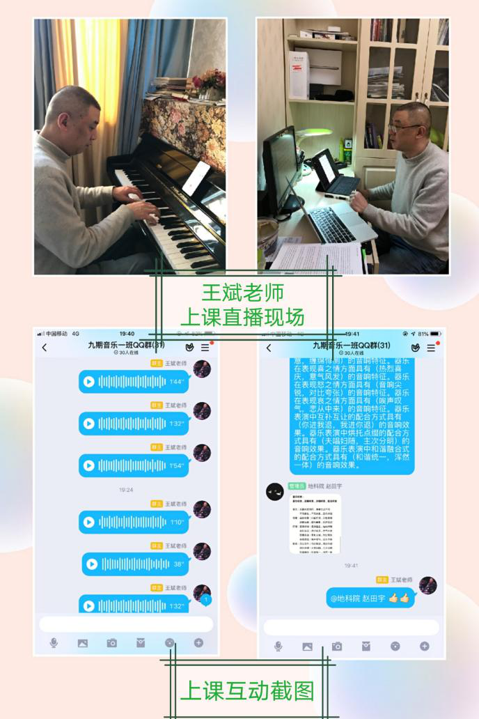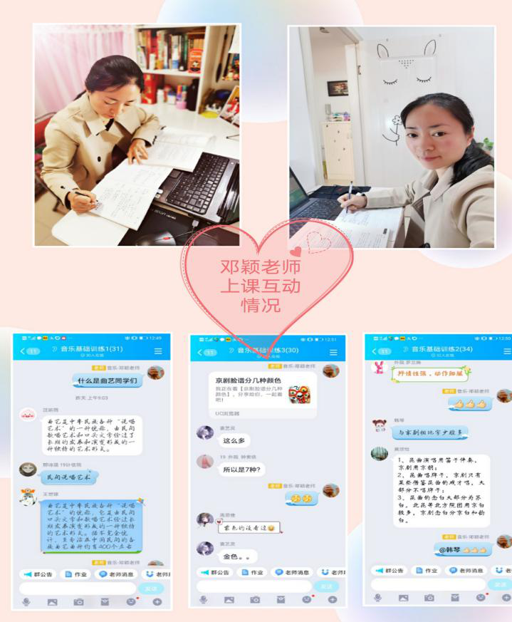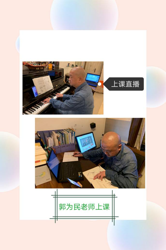 在老师们集体协作、团结合作下,音乐课程呈现出精彩纷呈,个性彰显的格局。老师们根据各自教学情况采用录播、直播、钢琴现场演示、声乐现场示范,教师间资源共享,音乐后期编辑、剪辑等各类教学方式。