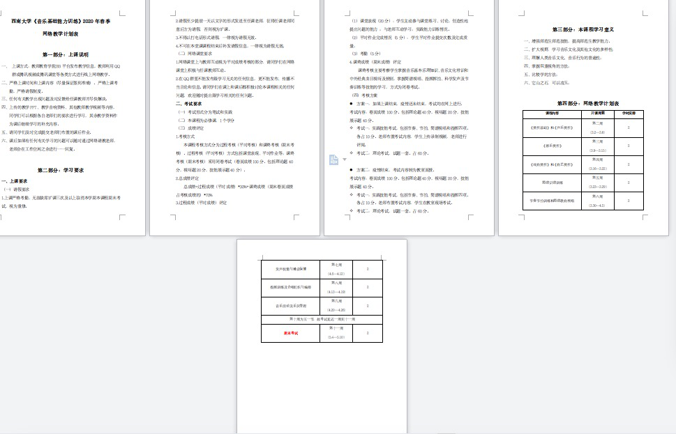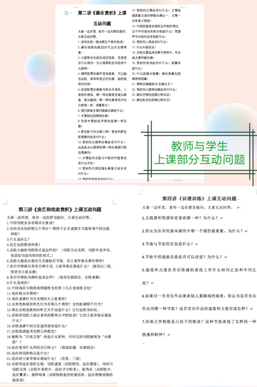 由于疫情来临,我们录课尚未完成,因此教师只有结合前期准备的录课再进行重新梳理制作录课。因为我们音乐课程在其他教学资源平台上未有完全直接的教学资源,因此在开课前我们教师团队采用线上集体备课。提前制定好教学计划和方案,音乐课程行课周期为9次课,我们采用教学团队中的教师负责一人负责一个版块,从教学资源收集、录制现场教学音视频等都进行了集体备课。