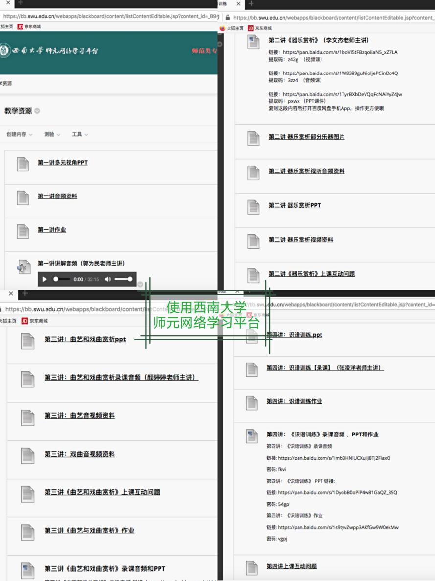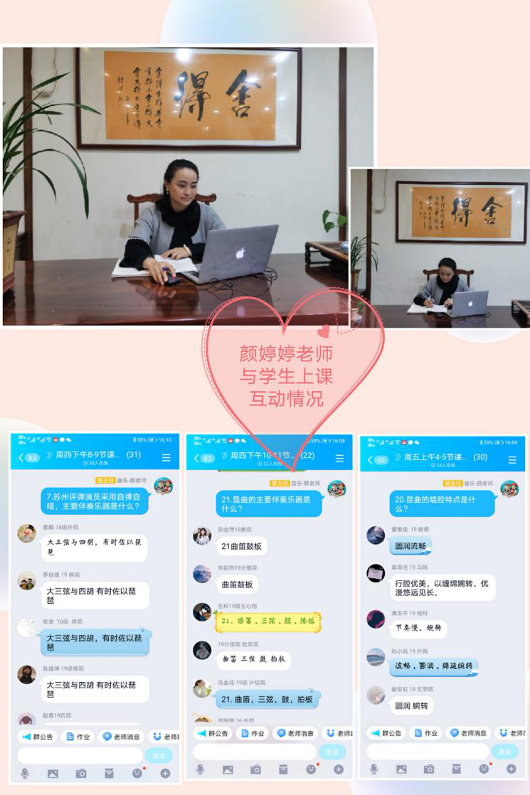 有的老师克服在老家没有好配制的电脑,还要照顾两个小孩的情况下,帮我们积极查找赏析的音响资料。有其他老师叫她帮忙范唱一下我们的简谱视唱,她也毫不推诿答应进行现场录音制作。