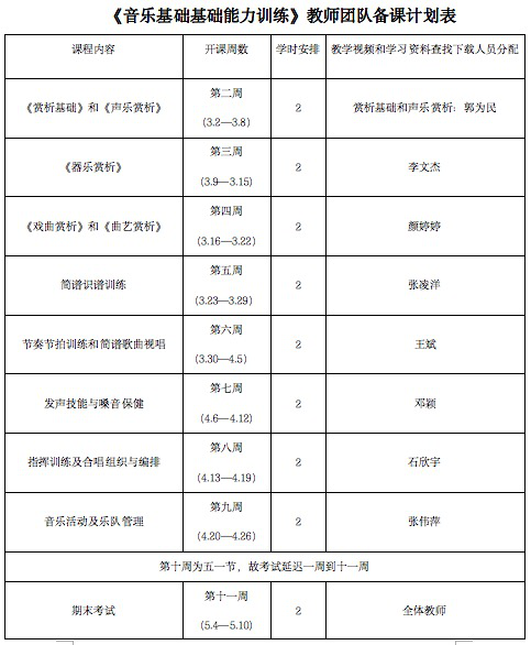 开课前组织本课程教师团队3次以上线上线下混合式教学讨论培训会,对采用何种方式上课、使用什么教学资源平台、如何使用师元BB平台等详细梳理了音乐教师团队网络行课的相关要求。要求教师对选课学生一一进行解释:上课说明、学习要求、课程学习意义、网络教学计划安排等问题。