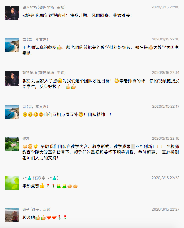 有的老师远在国外学习,她克服各种网络不畅通的情况给学生录课,同时准时给学生授课,她一边自己在学习,一边还给学生指导。还克服国外时差问题,甚至我们开视频研讨会议的时候,她一边听她的课程,一边听和我们开会,还积极参与我们方案制定讨论,还实时传出她的老师给她上课的教学声音。
