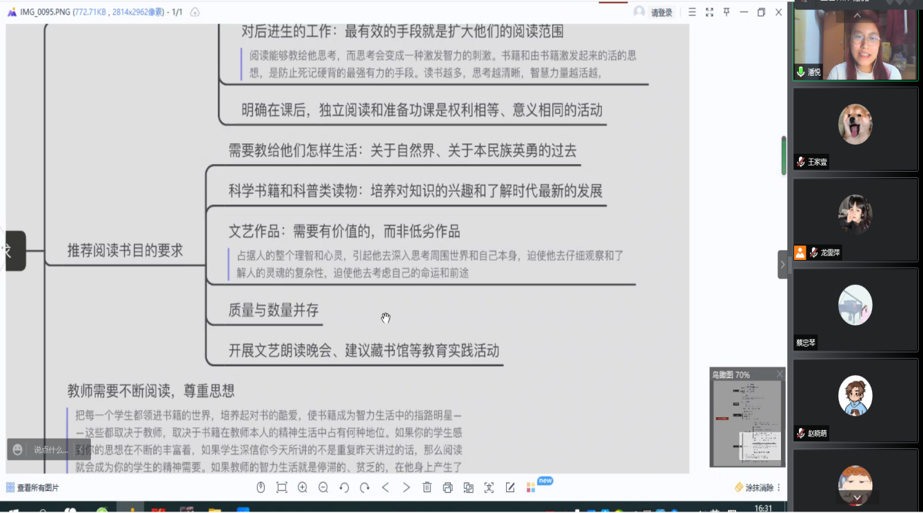 学科体育汪洪耀同学关注了在教学中存在的“学困生”现象,就学困生存在的原因、如何走出学困生的困境以及如何让学困生得到发展三个问题做了具体阐述;学科物理王家壹同学从失德艺人的社会现象出发,指出学生在道德层面上缺乏自我教育能力,强调教师在教学生涯要注重对学生道德的培育;学科语文潘悦同学做了阅读专题的主干梳理,用框架图展示了阅读的价值、有效阅读的标准和对教师的要求,提倡教师要终身阅读,树立尊重知识的理念。