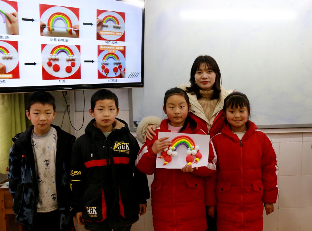 美术课上,志愿者张欢欢在课上讲解色彩知识,组织孩子们用颜料上色,课程接近尾声时,几名学生上台展示了自己的彩色作品。手工课上,志愿者马鑫采用小组合作的方式,让学生利用轻黏土捏出各种各样的造型,有五颜六色的彩虹、金灿灿的向日葵、立体的飞机模型等,体现了学生的动手能力和想象能力。