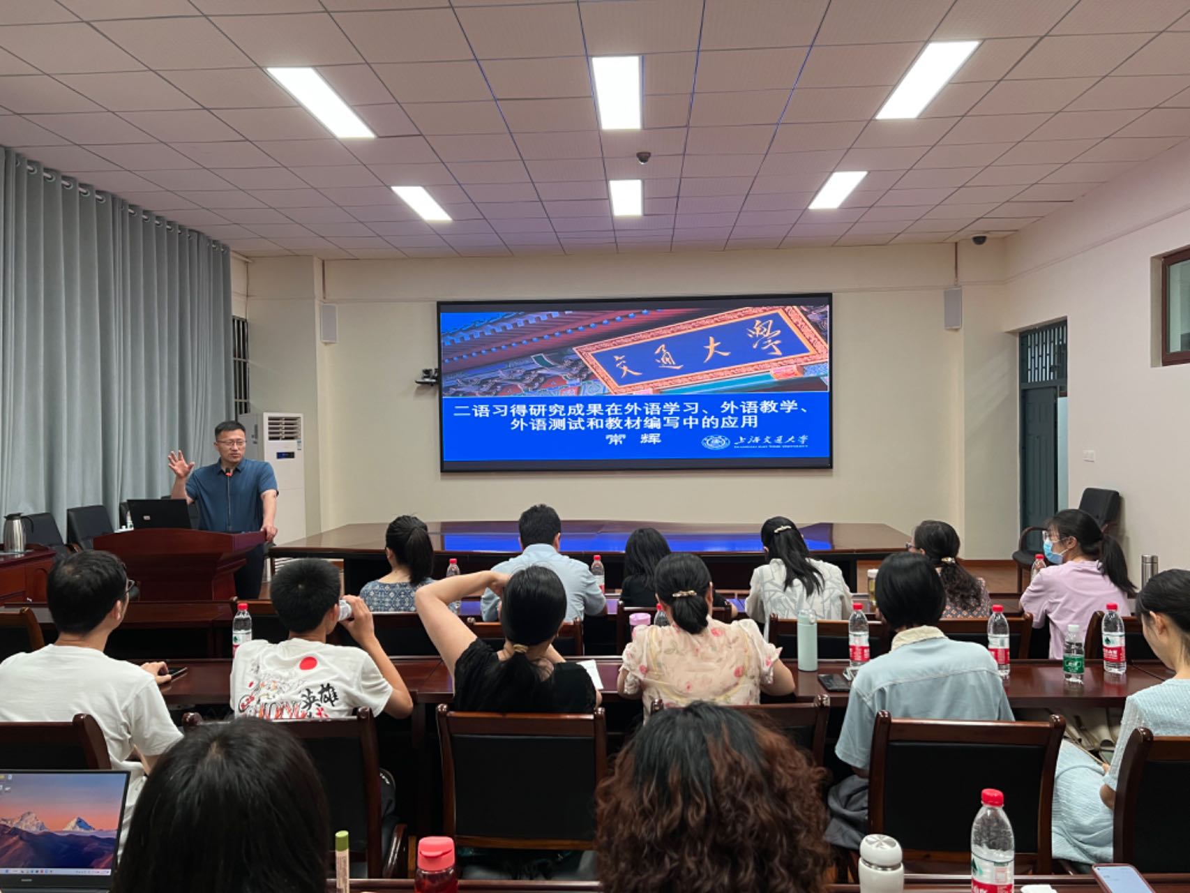 2023年7月3日下午,上海交通大学外国语学院教授、博士研究生导师、院长常辉教授受邀来我院做以“二语习得研究成果在外语学习、外语教学、外语测试和教材编写中的应用”为主题的学术讲座。讲座由我院副院长杨挺教授主持,来自教师教育学院、外国语学院以及教育部新时代中小学名师名校长培养计划中英语学科的老师和同学们在师元楼105教室共同聆听了此次讲座。
