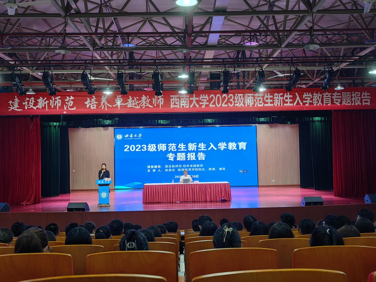 9月28日,学校2023级师范生新生入学教育专题报告在圆顶三楼报告厅举行。本次报告面向全校2023级师范生新生,由学校教师教育工作领导小组办公室组织开展,旨在加强公费师范生师德师风教育,树立师范生“躬耕教坛,强国有我”的志向抱负,坚定师范生争做“四有”好老师的从教信念。