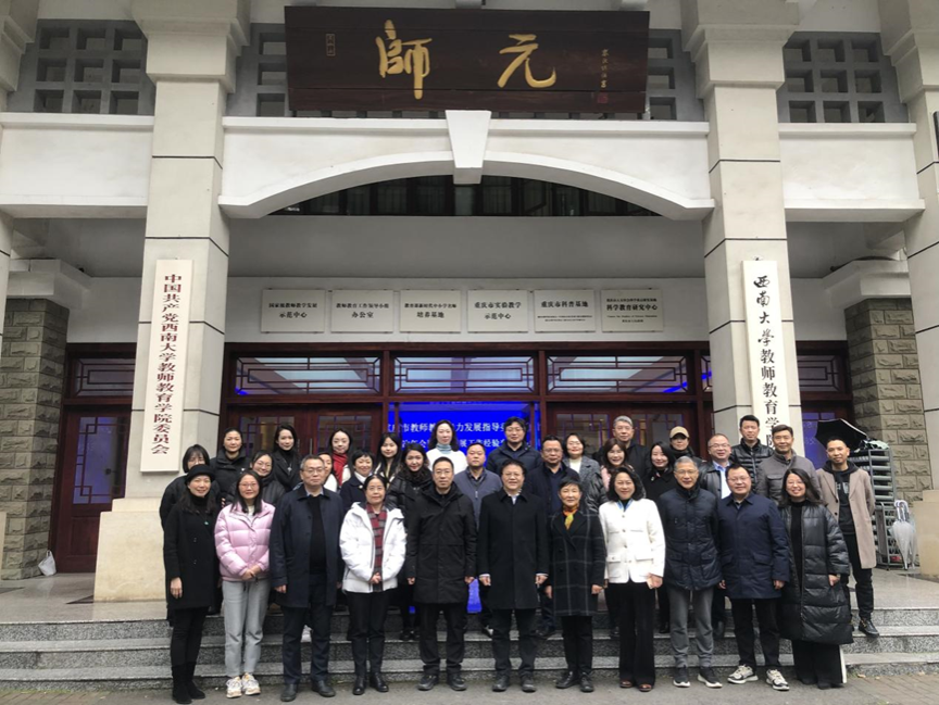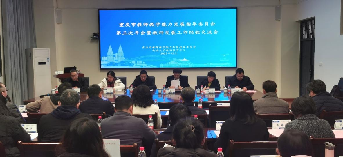 2023年12月28日,重庆市普通本科高等学校教师教学能力发展指导委员会第三次年会暨教师发展工作经验交流会在best365英国在线体育官网成功召开,best365英国在线体育官网党委常委副校长韩旭东、教指委主任委员曾孝平、副主任委员陈恩伦、申仁洪、郑旭煦、秘书长彭静以及重庆各高校教师代表参加本次会议,会议由教师教育学院院长陈恩伦主持。