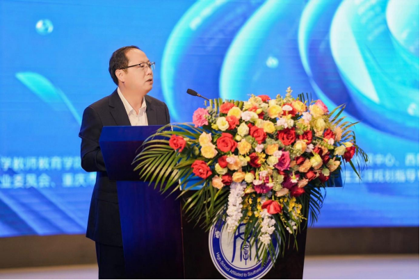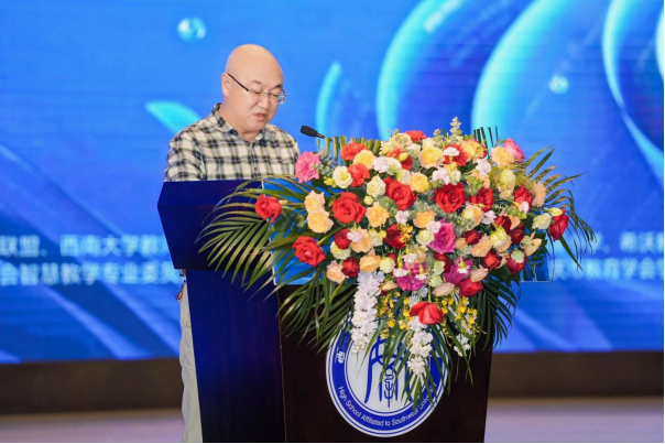 重庆市教委二级巡视员窦晓明代表市教委对此次年会的举办表示祝贺,并对推动数字化背景下大中小教学研一体化的深入发展提出三点期许:深化协同共建理念、构建数字化教育新生态;回应数字技术挑战、洞悉教育系统发展难题;立足教育强国目标、提供教育教学革新方案。