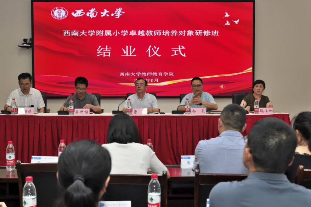 张旺书记作总结讲话。他首先对教师教育学院的支持表示感谢,对项目的圆满结业感到骄傲,对教师学员们付出的努力与获得的成果表示肯定。他指出,卓越教师研修项目意在助推教师发展成为高素质、专业化、创新型、拥有学术能力的专家性人才,驱动教师以教育成果滋养学校的发展路途。他期待,西大附小与教师教育学院能够继续深化合作,携手并进,为基础教育教师队伍的高质量发展共谋新篇。