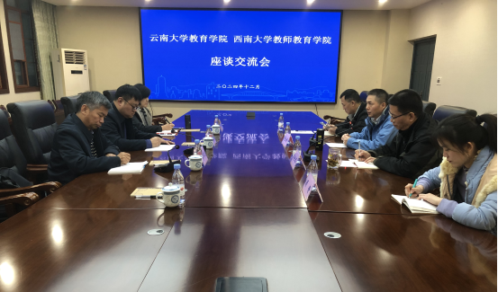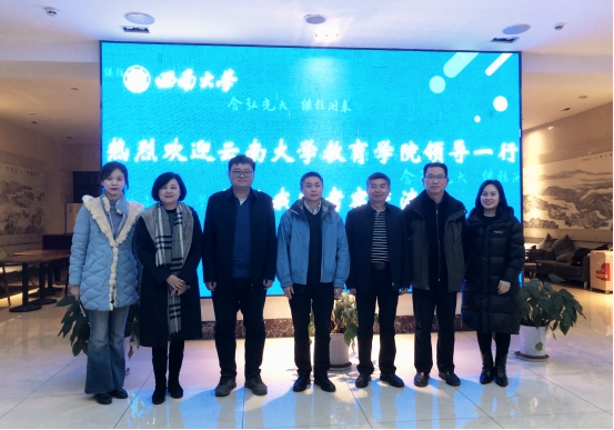 12月12日,云南大学教育学院党委书记张冀南、副院长李学文、教育技术研究中心主任赵兴碧一行到我院交流调研,旨在促进双方在教育领域的深度合作与协同发展。我院院长罗生全、原副院长李世讴、继续教育办公室主任杜正雄、组织员顾静参加座谈会,会议由李世讴主持。