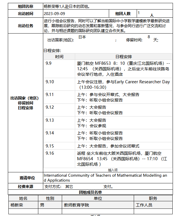 我院教职工杨新荣计划于2023年9月前往日本进行学术交流,详细计划与日程见表。