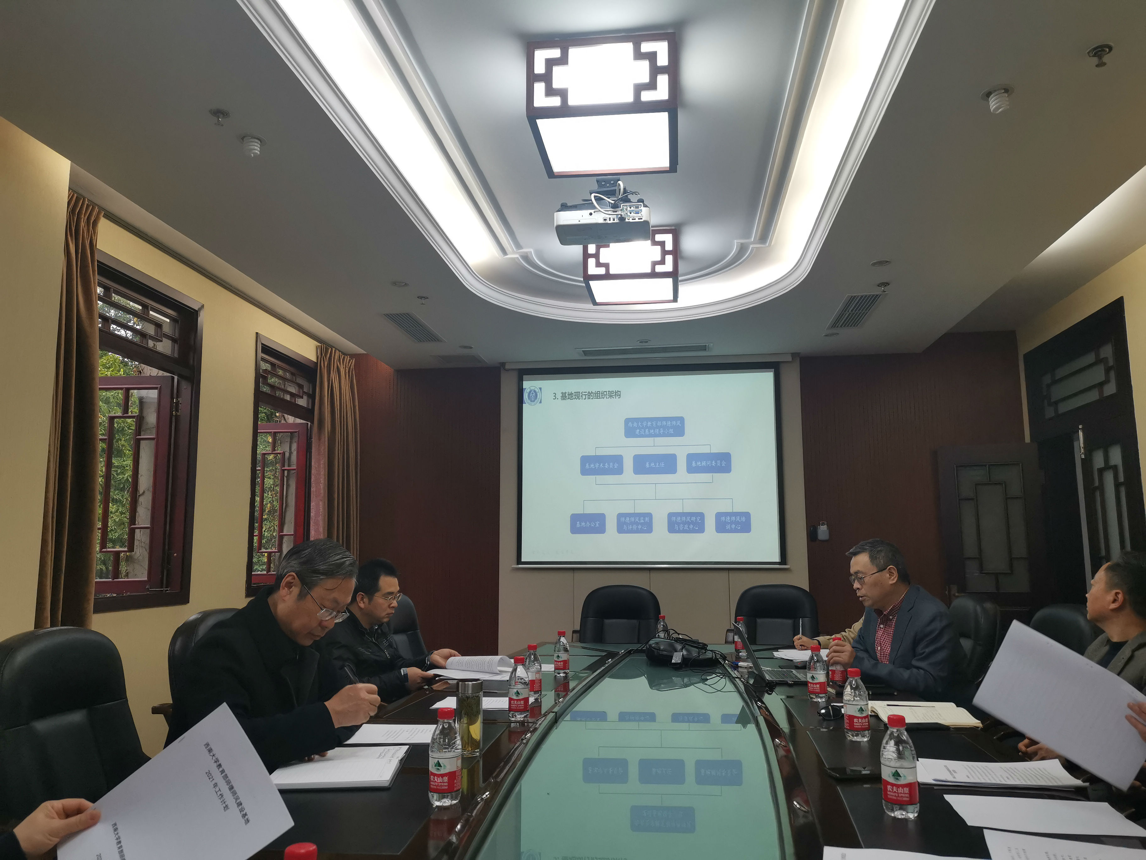 会上,教育部师德师风建设基地主任、教师教育学院院长陈恩伦教授就基地成立的缘由、教育部关于基地建设要求、2020年基地建设工作以及2021年基地建设规划作了详细汇报。陈主任在汇报中指出,基地成立时间虽然不长,但在教育部和学校的领导下,基地上下齐心,克服经费不足、人力缺乏等诸多困难,开展和完成了一系列师德师风建设活动,如承办“重庆好老师”评选活动、主办庆祝学校第三十六个教师节暨师德师风建设论坛、与教育部关工委社区教育中心联合主办第二届寻找中国“好老师”公益推选活动等;完成了教育部教师工作司委托的《幼儿教师师德师风调研报告》撰写任务;在CSSCI期刊上推出了一批具有一定学术影响力的科研成果;编印了《教育部师德师风建设基地简报》和《师德师风建设与研究文件汇编(2012-2020)》。对于2021年基地建设工作,陈主任从研究队伍建设、提升幼儿教师师德师风调研报告撰写质量、强化大中小学校教师师德培训实效、组织学生利用署期社会实践开展“寻找身边最美好教师”活动、打造基地“师道文化”等方面提出了系列规划。